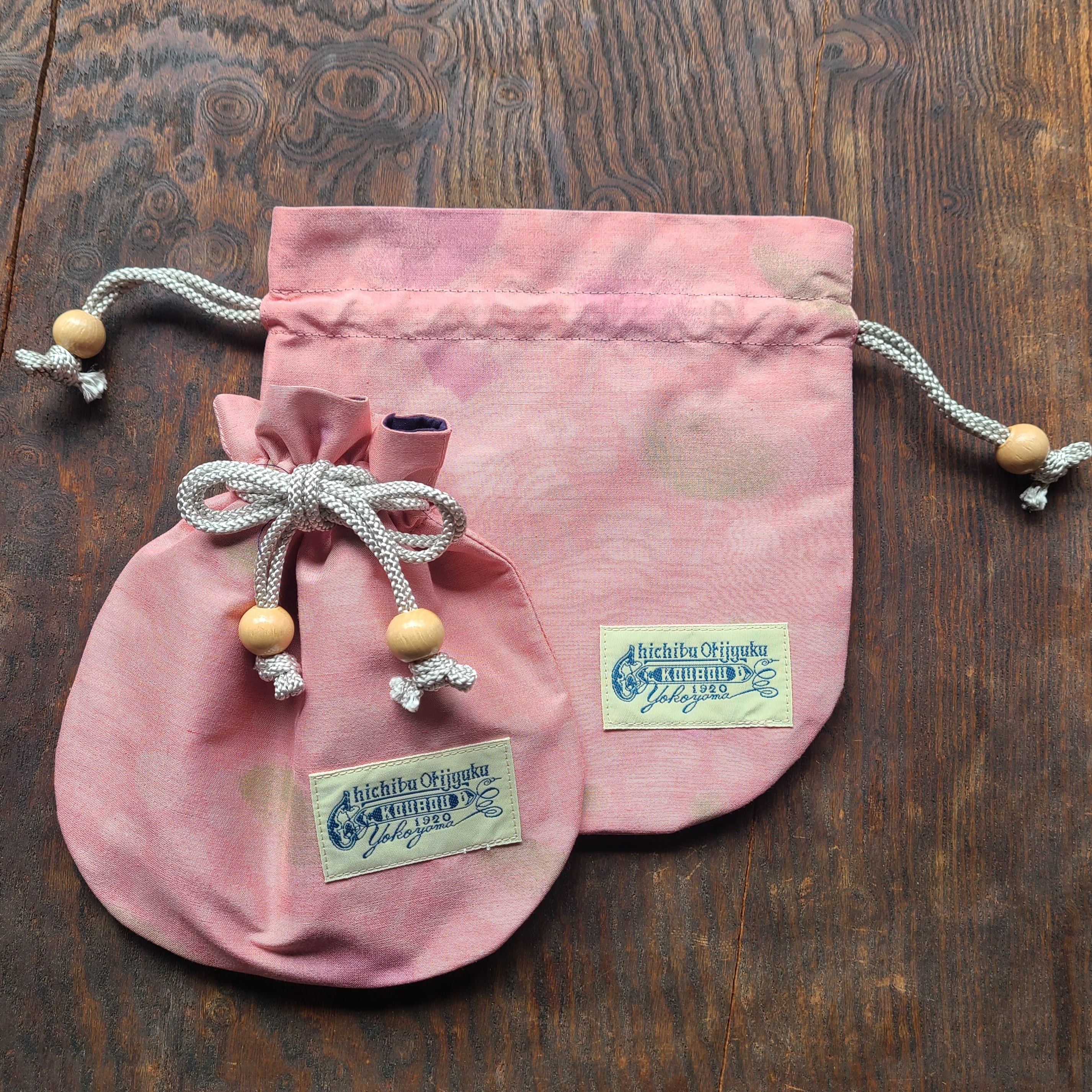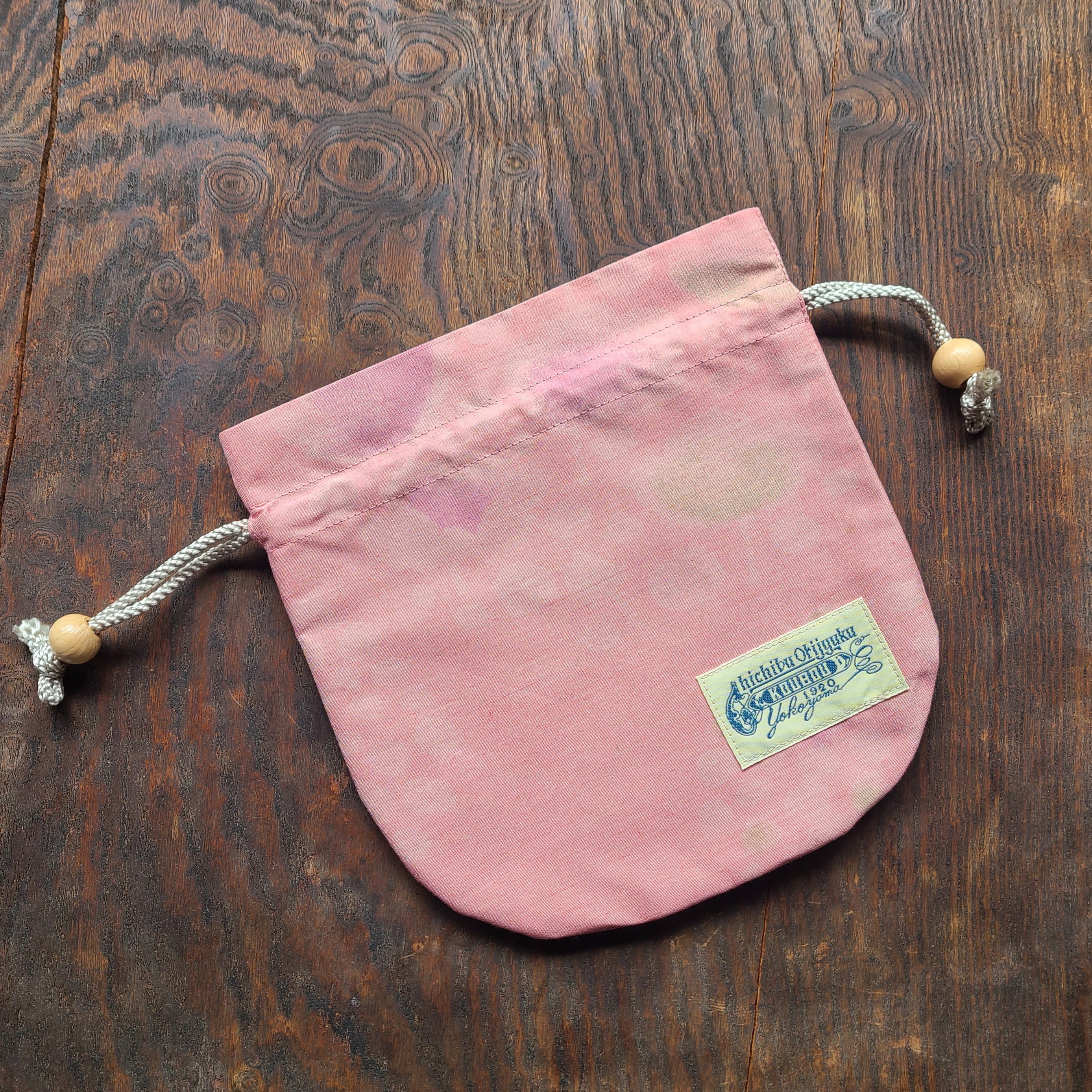 ほんわか可愛らしい雪のような花柄の秩父銘仙で巾着袋を作りました。ウッドビーズがアクセントになっています。秩父織塾工房横山のオリジナルロゴマークのタグ付きです。