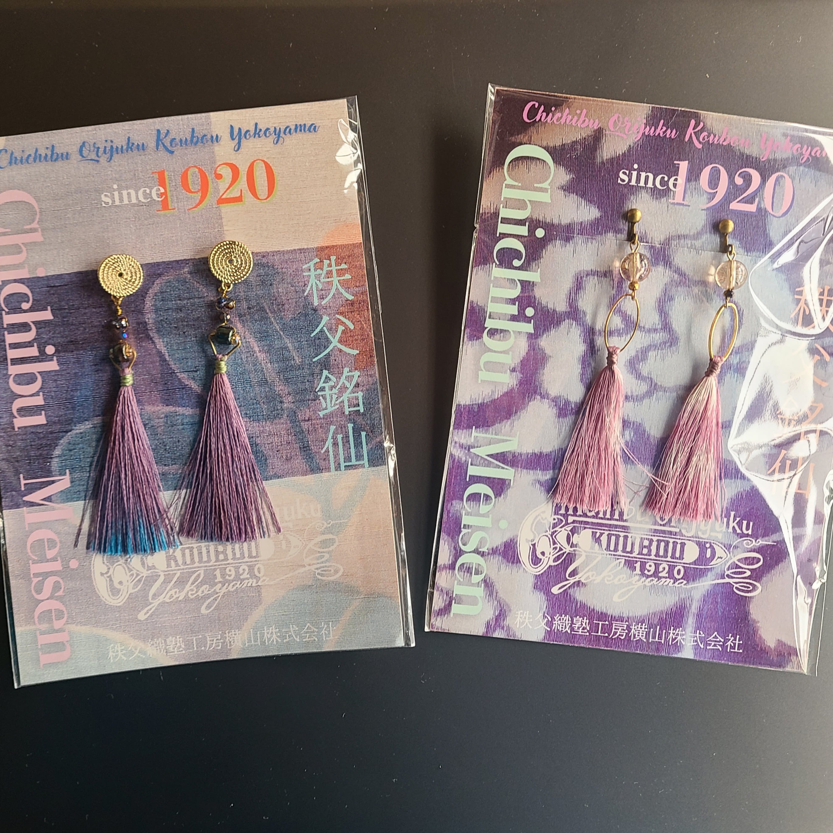 光本さま専用 秩父銘仙タッセルイヤリング/ピアス ③藤色と白のタッセル。 透明なビーズのゴールドイヤリング (左下) 紫色とブルーのタッセル。 ダークなブルー系の渦巻きピアス。 1つ2750円 2つ5500円