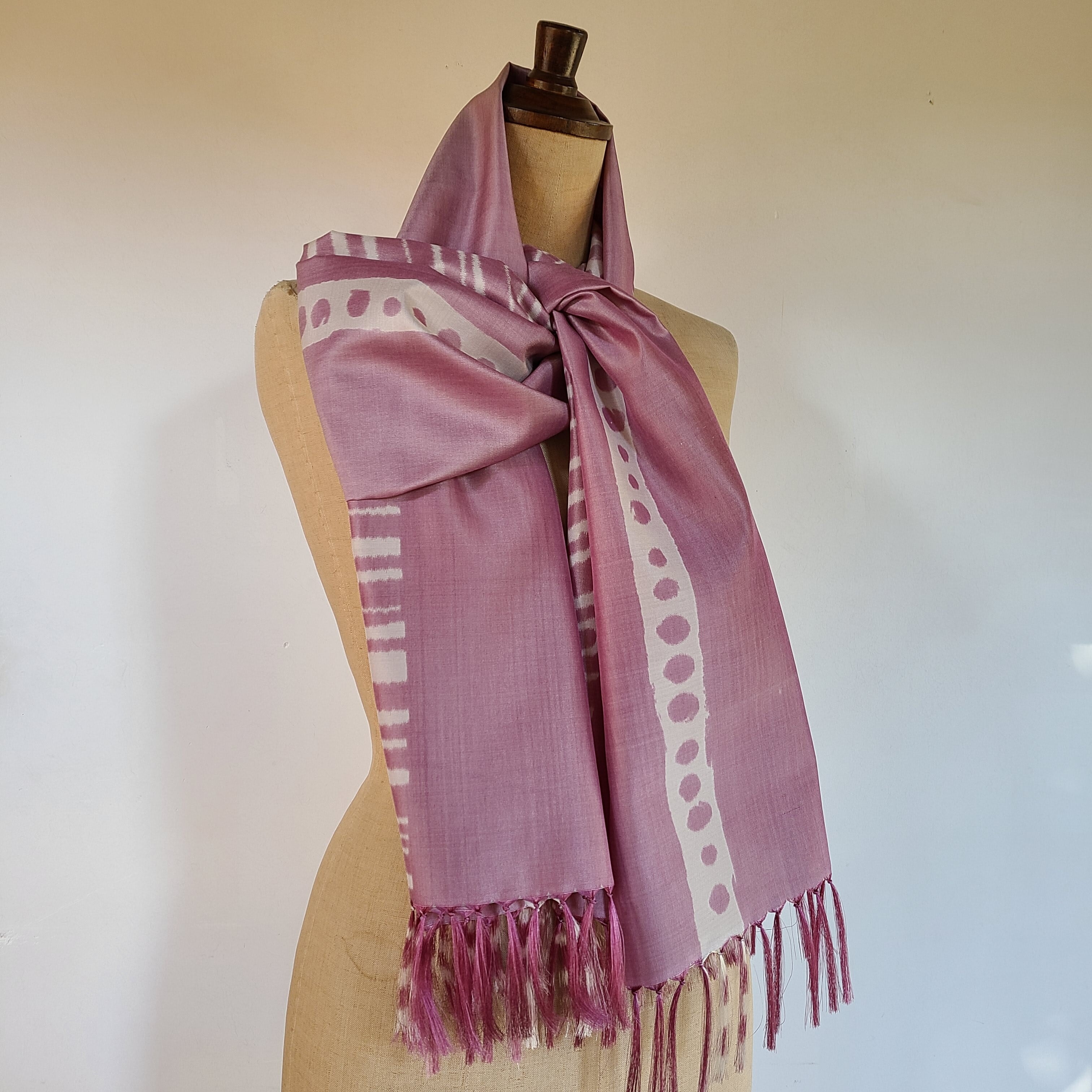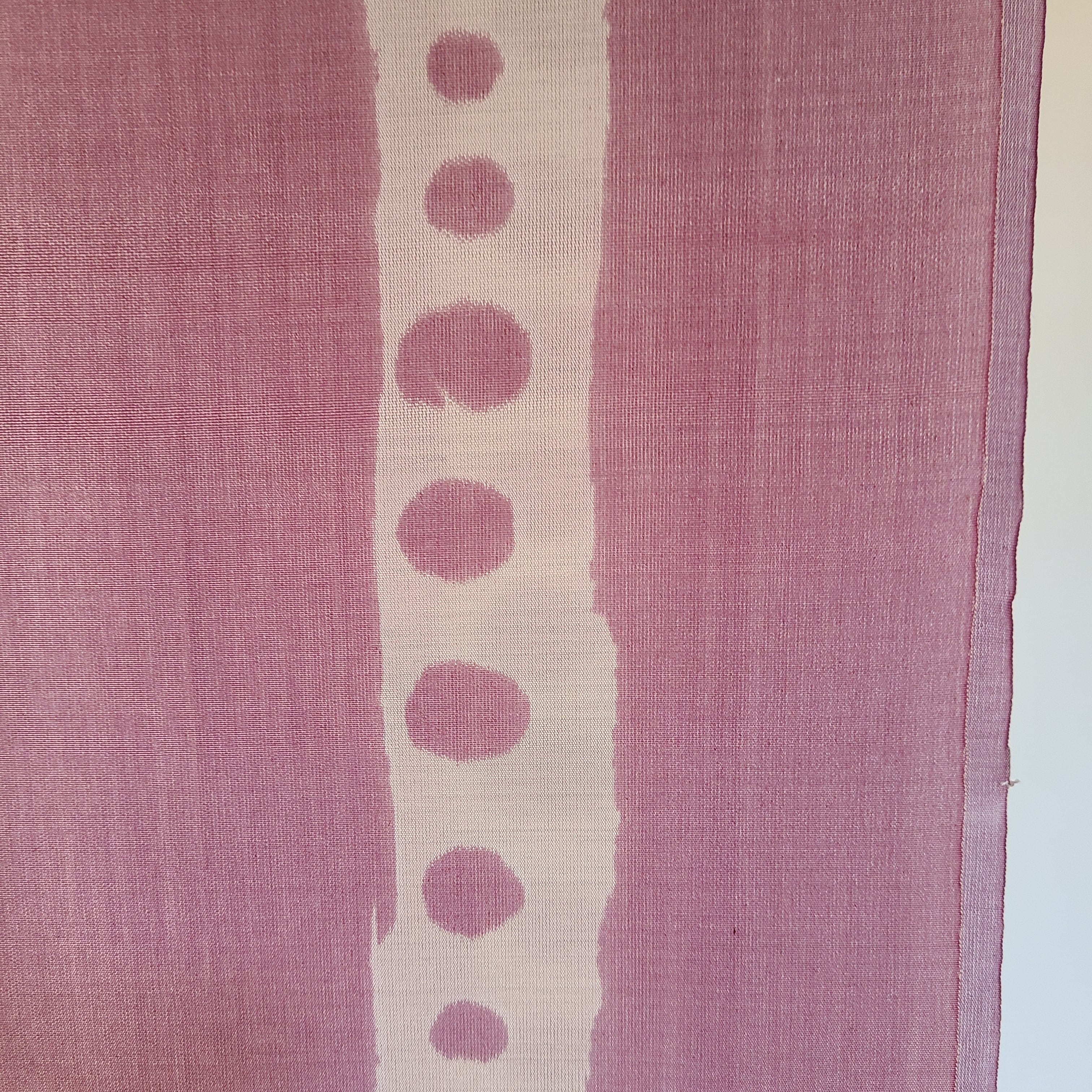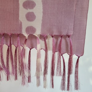 秩父銘仙スカーフ〈杉綾むらさき×灰桜〉のスカーフはよこ糸をグレーがかった薄い桜色の糸で織りました。優しい表情でつややかな銘仙に織り上がり上品な秩父銘仙になりました。首もとを華やかに演出してくれます。