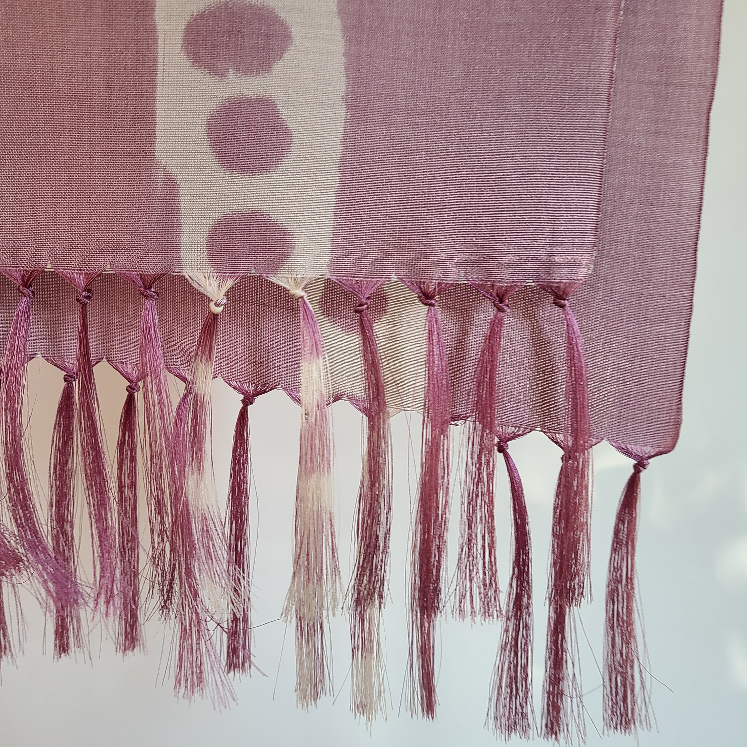 古代紫のたて糸に灰桜色のよこ糸を使い、つややかでシックな色合いの秩父銘仙のスカーフに織りあがりました。
